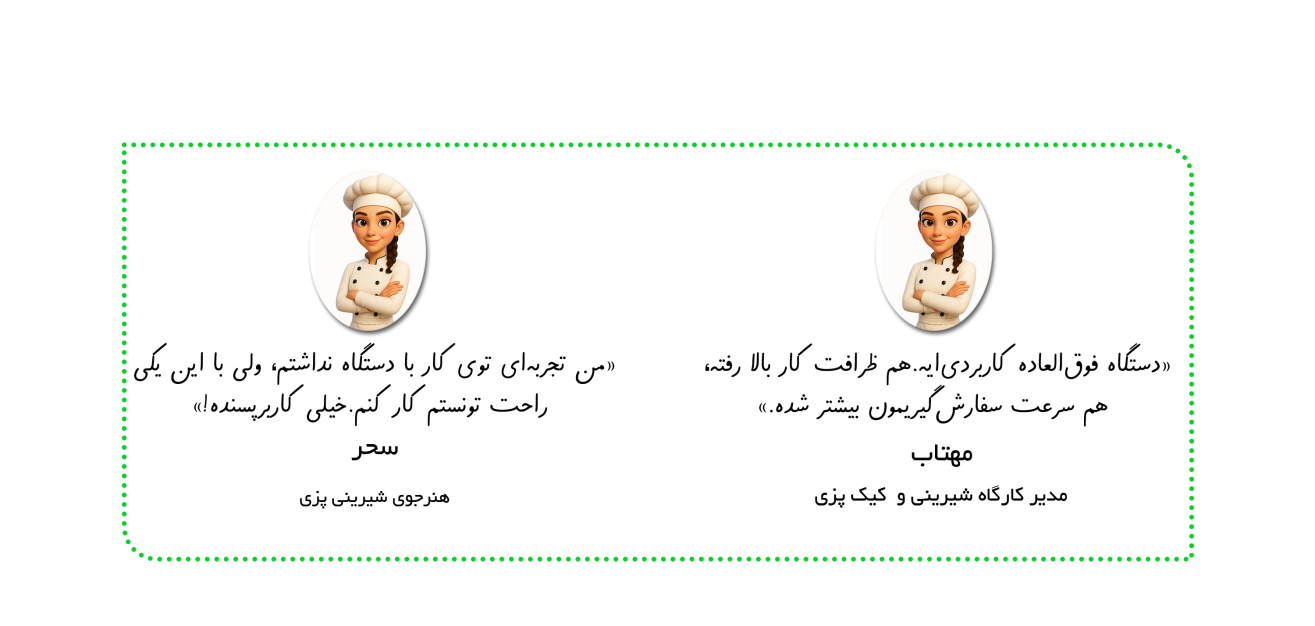 ما با طراحی و تولید دستگاه های هوشمند خامه کشی، تلاش می کنیم تا تزئین کیک را برای همه ( از قنادهای حرفه ای تا کیک پزان خانگی ) ساده تر و دقیق تر کنیم.​​​​​​​